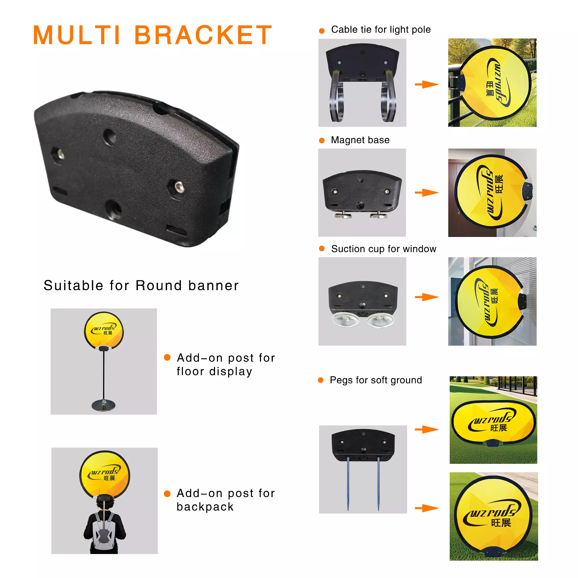 Disc banner Mult-bracket - Versatile & Portable 2025/08/12 WZRODS Multi-Bracket Display: Portable steel frame for 45cm-100cm round/oval banners. Magnetic/suction/peg/cable tie mounts. Ideal for events, retail & golf signage. wzrods....More>> # Base / weight / bracket